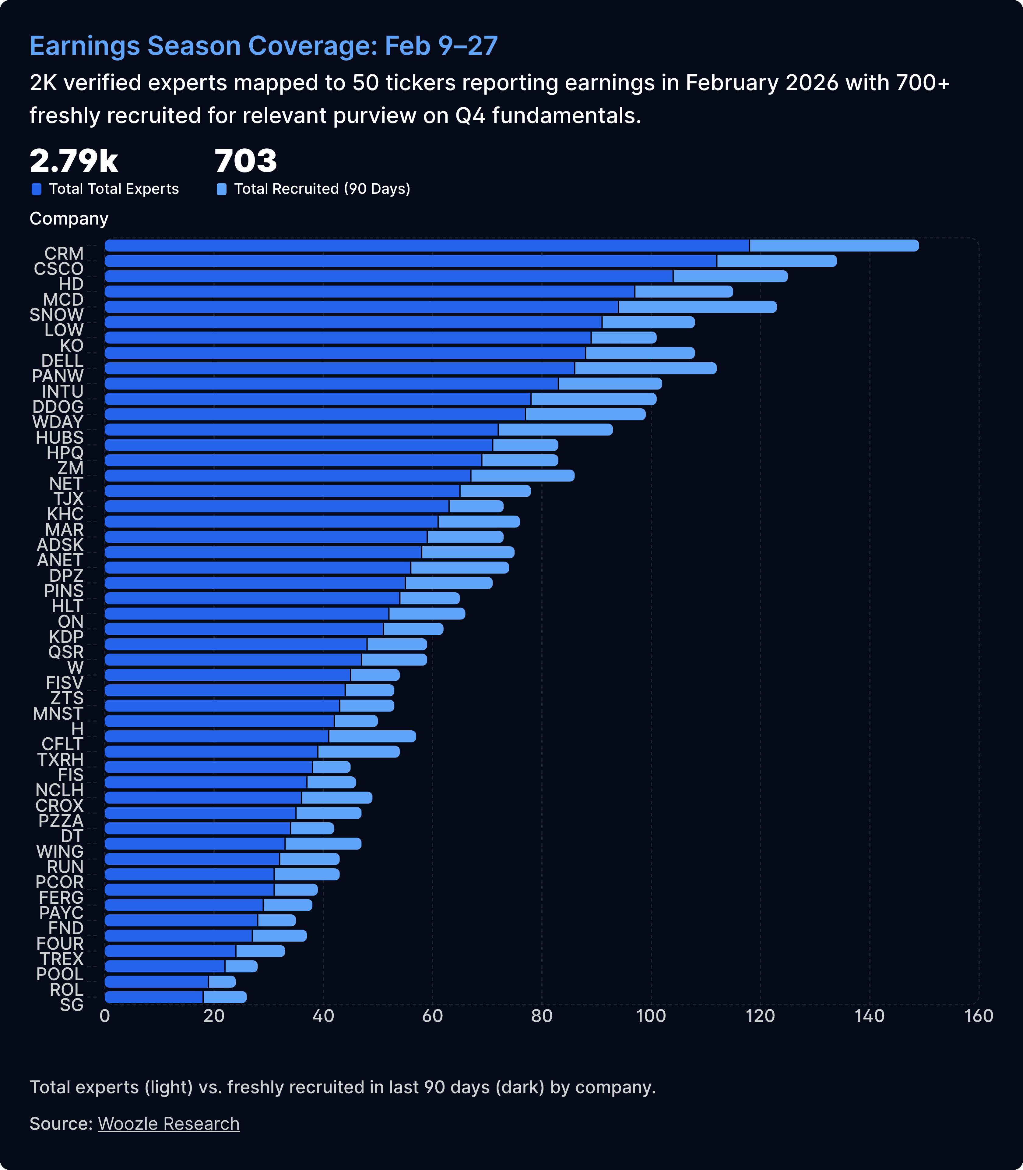 2,790 verified experts across 50 tickers. 700+ freshly recruited in the last 90 days with direct operational purview on Q4 fundamentals. The kind of practitioners who can speak to consumption trends at Snowflake, platform consolidation at Palo Alto, Pro demand at Home Depot, or seat expansion at Salesforce—not because they once worked in the industry, but because they have current visibility into the metrics that move estimates.